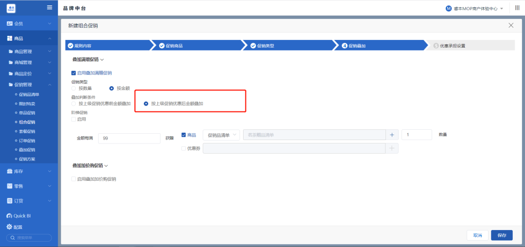 03 促销支持按优惠后的金额进行叠加 可自定义设置促销的叠加判断条件 根据优惠前/优惠后金额判断是否达到叠加条件 满足商家多样化的促销