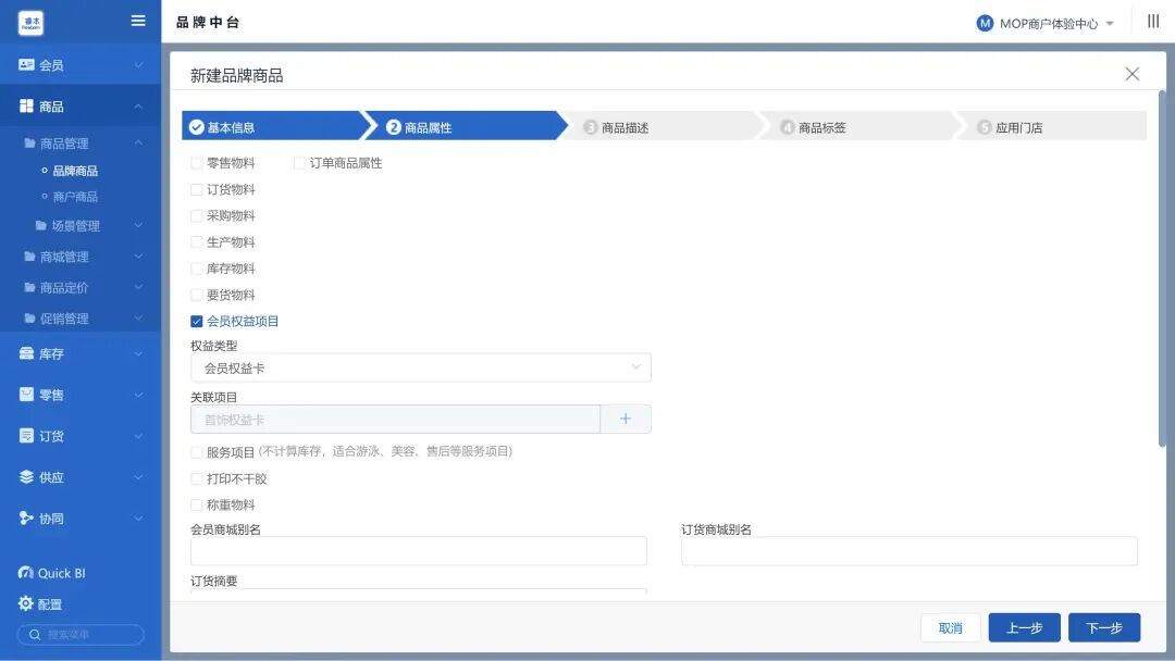 ![]() 商品关联『会员权益卡』 第三步,在新建「品牌商品」板块,填到第②点「商品属性」时,勾选「会员权益项目」;然后在「权益类型」选择「会员权益卡」;并关联相应的权益卡;完善好剩下的商品档案信息,最后点击【完成】保存。
