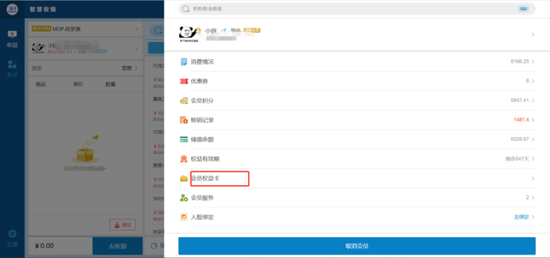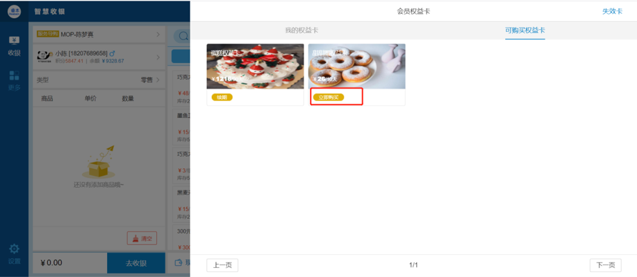 第三个入口,会员到店购买。导购可在智慧收银或店务助手销售:选择会员后,可在会员权益卡页面选择相应的权益卡下单购买。