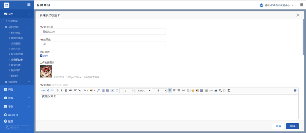 第二步,填写权益卡名称 & 有效天数;上传权益卡封面图片;权益说明 & 购买说明可通过文字or海报形式展示;最后点击【完成】保存。