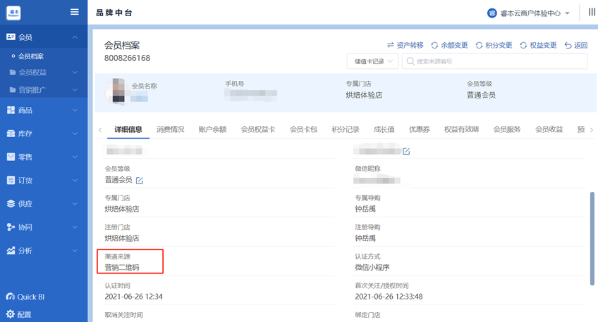 点击右列的「会员档案」,打开相应的会员档案便可查看该会员的来源渠道。