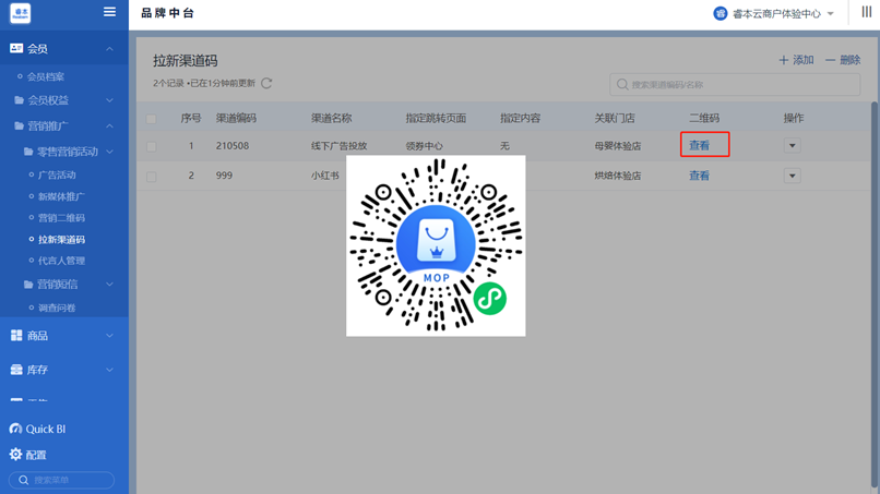 打开「拉新渠道码」页面,点击「查看」便会弹出相应二维码,右击图片即可下载。【PS:渠道码可放到相应的推广物料中,新会员扫码后即可关联渠道来源。】