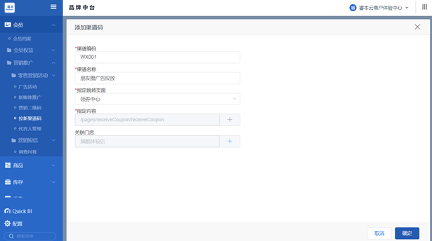 然后填写渠道编码、渠道名称、指定跳转页面、指定内容和关联门店,最后点击「确定」便可生成该渠道的二维码。