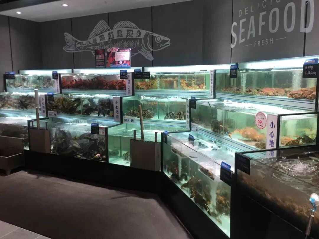 时代广场店9点半营业,9点时所有商品上货已达90%,尤其是活鱼类与熟食加工类商品,员工工作效率很高。所有商品周二日清,周三9点时所有鱼缸与货架都满了,这对采购与门店的现场管理考验很大。