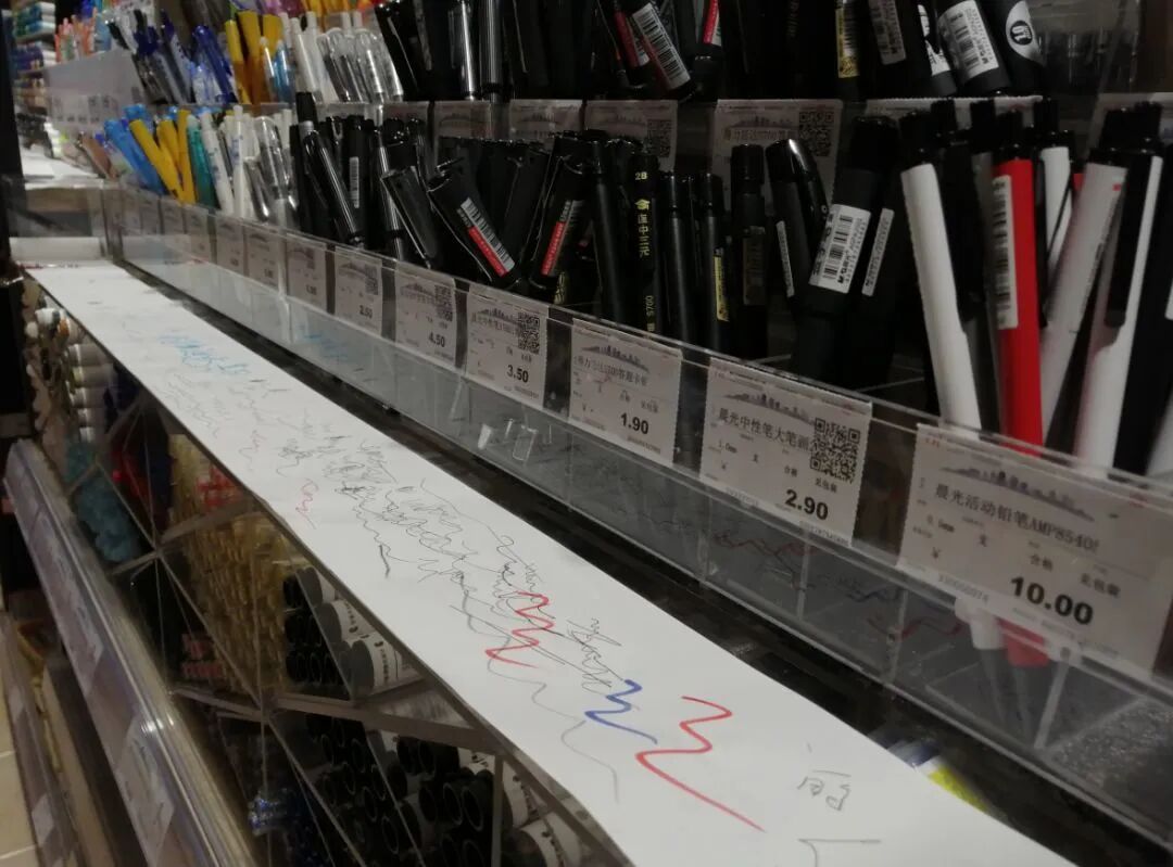 文具区笔架前铺放白纸,便于顾客试用。