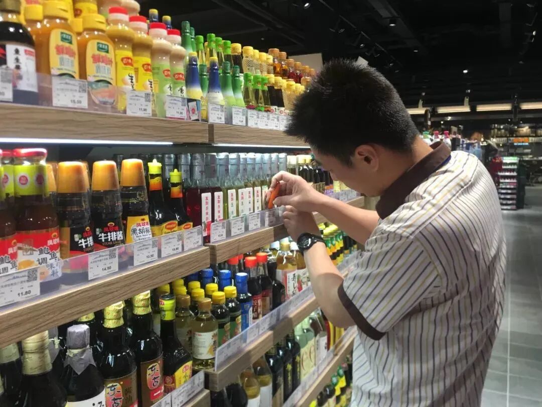 员工入场进行仪容仪表及带入物品检查,开门营业前,各岗位员工工作井然有序。有的在上货;有的在做价签更换;有的在擦货架打扫卫生;有的在做水果分切……基本听不到说话声,管理层在仔细检查商品品质,问题商品提醒一线员工及时处理。