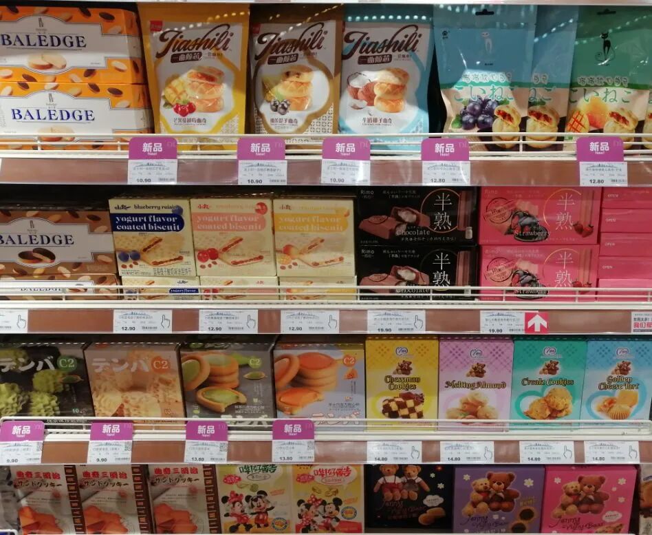 饮料(如可口可乐、康师傅)或饼干类(如达能、真巧、康师傅)等常见品牌要不没有,要不单品很少,且放置在货架底层。网红商品、进口商品或地方品牌陈列在货架的黄金位置,商品更新换代很快。