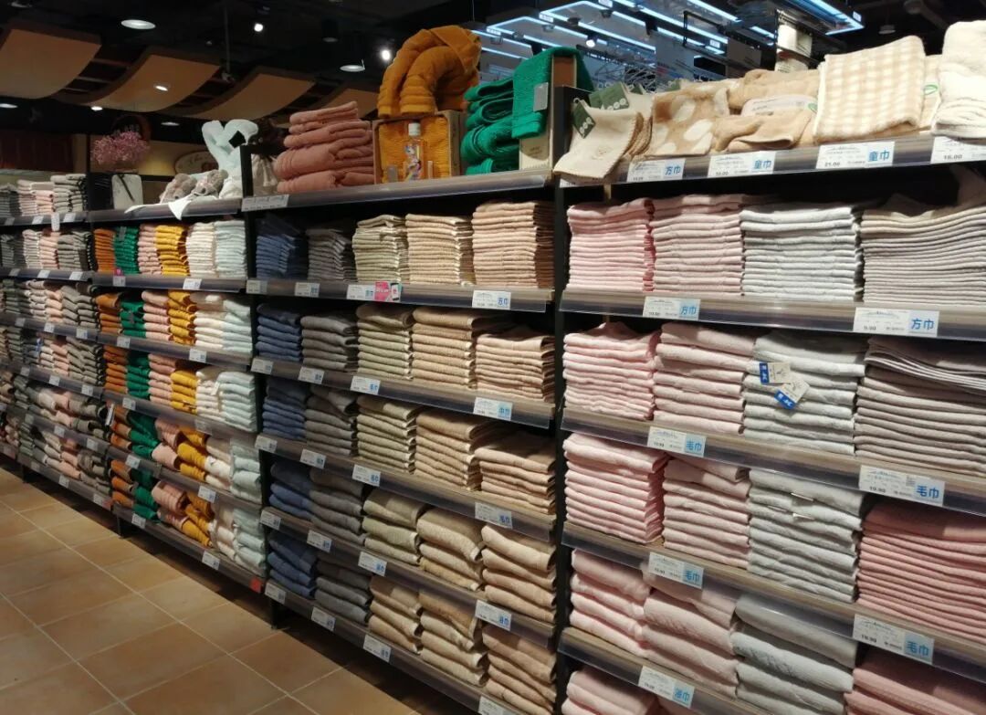 毛巾按颜色陈列,一竖排是一个颜色,一个套系选择一个经典颜色进行布局。整体看上去就像一幅画卷。