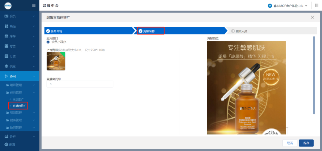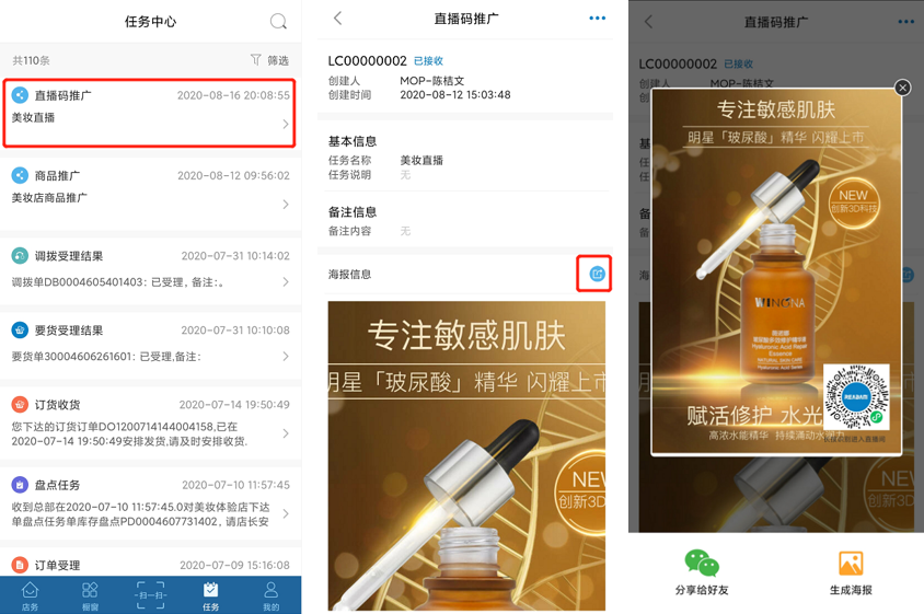在直播推广上下了些功夫,商家可以在任务管理中新增“直播码推广”模块,导购完成直播推广任务,