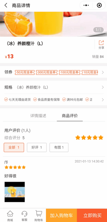 07 会员商城-商品评价图片点击支持放大 会员商城查看顾客购物评价 图片支持放大查看 展示商品细节 方便买家参考购买