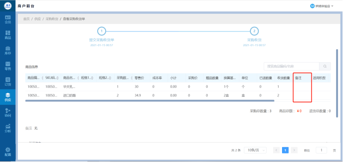 06 采购订单-收货支持填写行备注 采购收货过程中 若商品有数量/质量等问题 支持填写行备注 记录收货情况