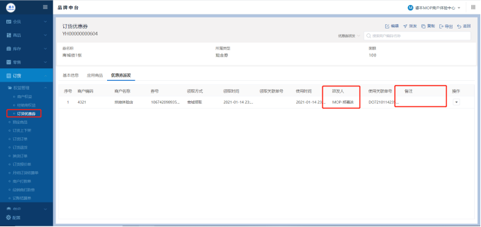 05 订货优惠券-增加“派发人”及“备注”字段 订货优惠券派发时支持填写备注 查看明细/导出时增加派发人及备注 完善记录 方便追踪溯源