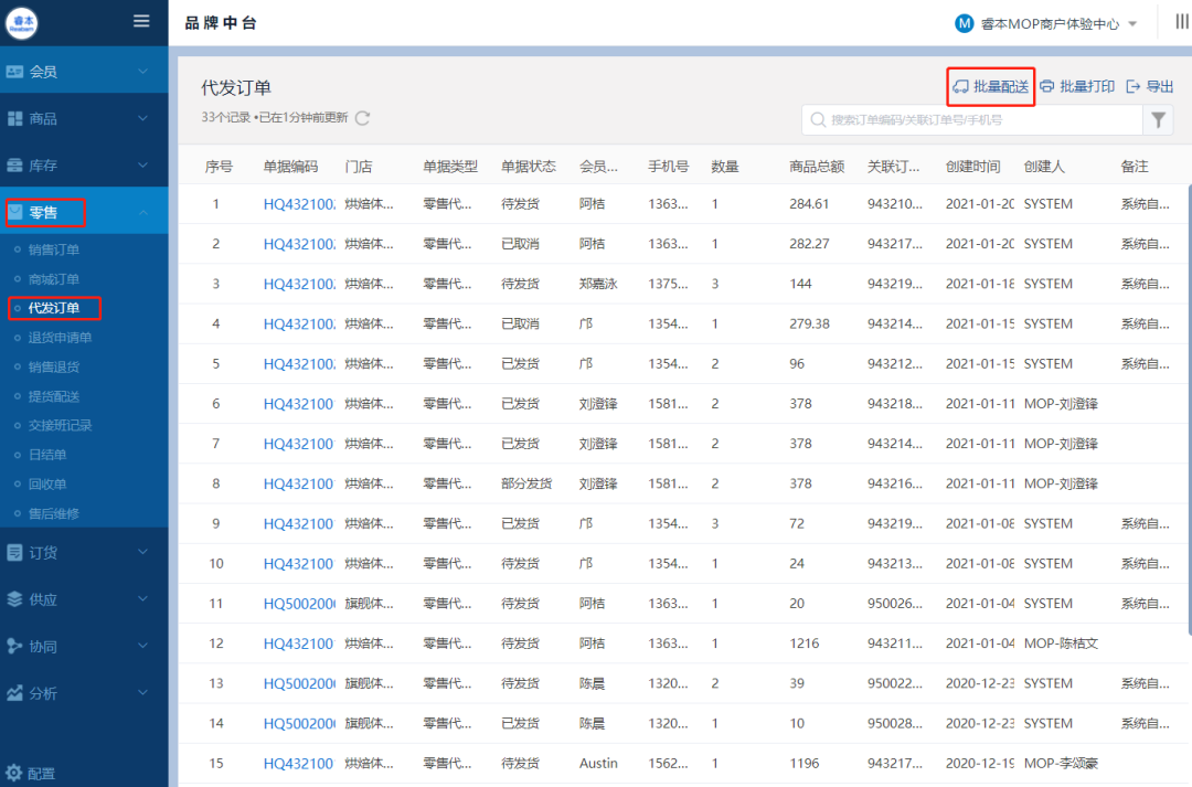 产品更新|新增批量配送功能,提升零售企业配送效率发表时间:2021-03-21 22:04 零售企业为什么要提升配送效率? 配送不是单纯的运输或送货,而是运输与其他活动(拣货,集货,配货)的组合,是“配”与“送”的有机结合。在很多中小企业管理者眼中,仓库的配送就是依据客户的要求,按照“表格”中的信息,叫来物流、或者自己车队的人来将相应的货物送走。 对于电商和零售企业而言,它不仅集装卸、包装、存储、运输于一体,还具有降低采购成本、促进销售与提高商品流动效率、保证货源稳定性等功能。 在这个互联网和物流行业飞速发展的时代,从以前的车马慢,到现在的隔日送达。打造高效、低成本的配送体系对零售企业来说具有重要意义。 MOP新增批量配送功能,提升企业配送效率 基于客户需求以及MOP团队自主优化,新增「批量配送」功能,可通过高级筛选条件批量配送商城订单,帮助品牌提升订单配送处理的工作效率。