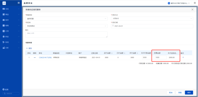 16 采购结算单支持设置结算单的优惠金额 若结算时供应商提供了优惠 新增供应商结算单支持填写订单优惠金额 记录与供应商结算的优惠金额及实付金额