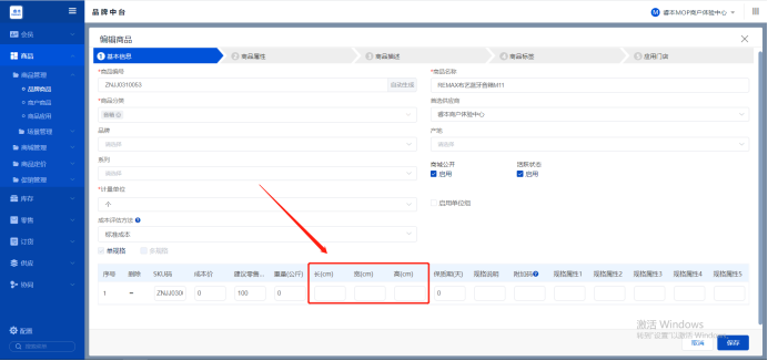 04 商品档案新增长、宽、高字段 商品档案新增长、宽、高字段 对于某些商品需记录规格、尺寸等信息 可在商户档案直接维护