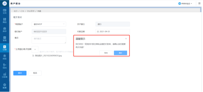 11 商户打款单提示优化 同一时间付款相同金额多次或单笔付款超过100万时 系统弹出温馨提示 客户进行二次确认