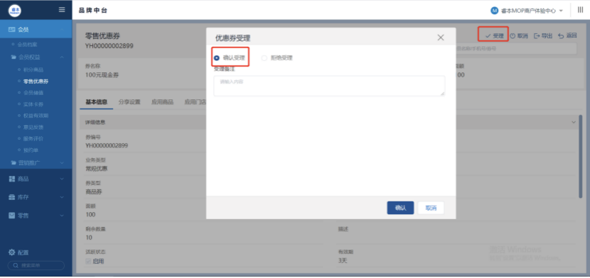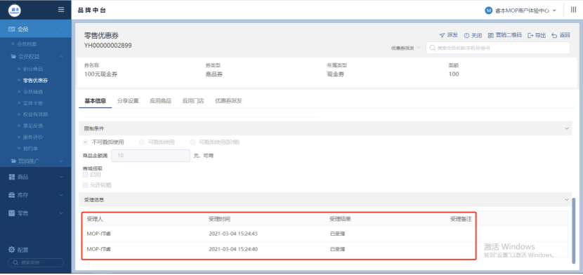 06 零售、订货优惠券新增受理流程 零售、订货优惠券新增受理流程 对于某些品牌的管理中台人员可开启优惠券受理功能 开启后新增的优惠券只有经过了审批才能派发