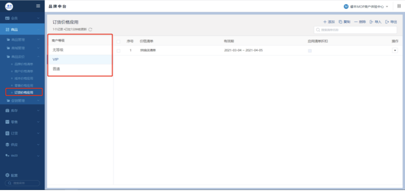 10 订货价格应用支持按商户等级设置 根据等级维护价格,由于等级是动态的 无法有效的手动维护处理 如今支持按商户等级应用订货价格,极大的提高了工作效率
