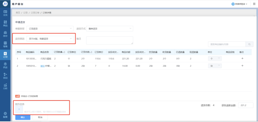 09 订货退回新增填写原因、上传附件功能 订货退货时需要有退货原因的选择 如厂家召回,正常退货等 退货发货时需要上传附件,需要知道发货的物流信息