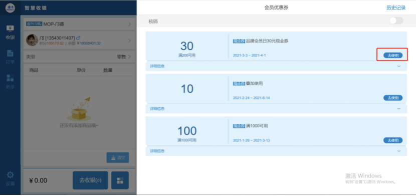 03 优惠券增加“去使用”功能 当店员/会员直接核销优惠券时,自动带出优惠券可使用的商品选择完成后,跳转到下单界面 让优惠券的使用更加方便、快捷